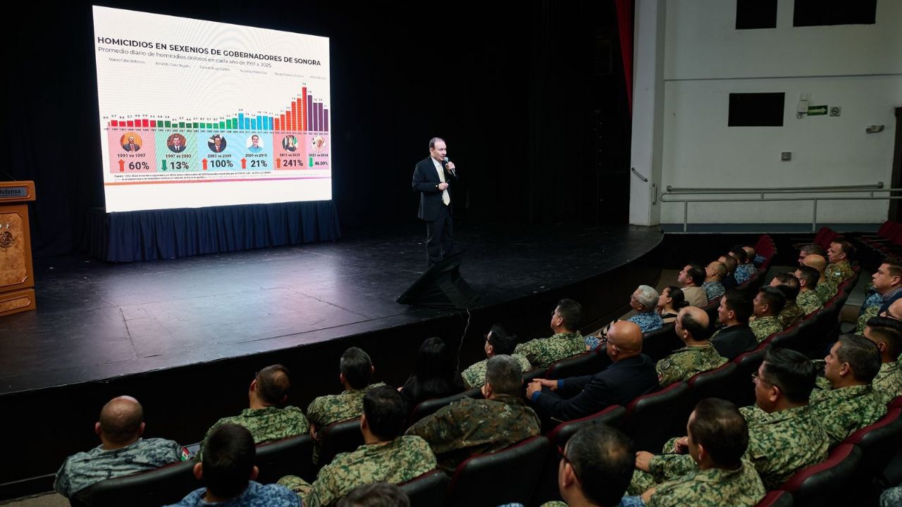 Durante su exposición, el mandatario sonorense, acompañado de José Ernesto San Román Águila, director del Colegio de Defensa Nacional; José Manuel Guevara Castillo, comandante de la Cuarta Zona Militar, subrayó que el Plan Sonora representa una estrategia integral de Estado que articula crecimiento económico, transición energética y estabilidad social, elementos indispensables para la seguridad nacional y el bienestar regional.