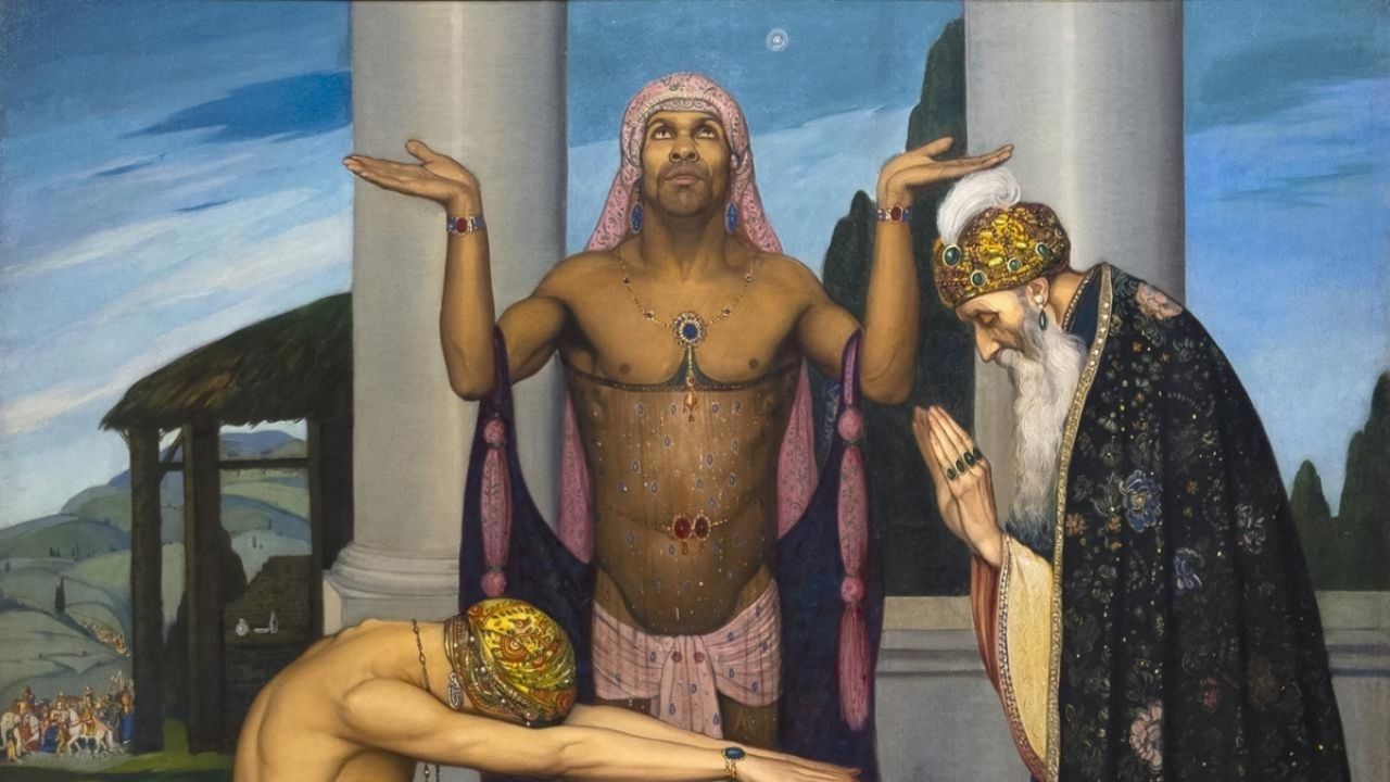 A decir del curador, esa pieza es modernista al tiempo de que recupera los conceptos exóticos del orientalismo, que se pueden ver en los cuerpos de los reyes, en las transparencias y los brocados de las capas, además de ofrecer algunos guiños sobre arte popular mexicano, específicamente en las vasijas y las bateas de Michoacán.