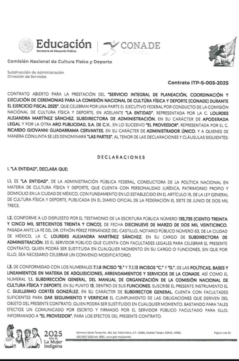 El 29 de julio de este año, dos días antes de que dejara la Coordinación de Comunicación Social, la entonces titular Daniela Caballero Domínguez, gestionó que la Conade le extendiera un contrato a la empresa Aro Publicidad SA de CV por el concepto de “servicio integral de planeación, coordinación y ejecución de ceremonias para la Comisión Nacional de Cultura Física y Deporte durante el ejercicio fiscal 2025”, con una vigencia de cinco meses, es decir, hasta el 31 de diciembre.