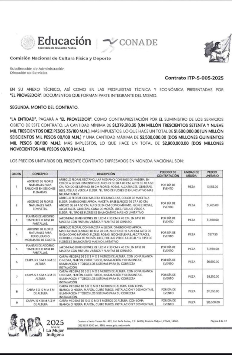 Para el ejercicio fiscal 2025, ya bajo la dirección de Rommel Pacheco, Conade volvió a contratar los servicios de Operadora de Comedores Saludables SA de CV por un mínimo de 39 millones de pesos y un máximo de 97.7 millones para solventar entre 147 mil 840 y 369 mil 720 alimentos durante todo el año, distribuidos en desayunos, comidas y cenas, así como colaciones, box lunch y coffee break en las instalaciones de Villas Tlalpan, Cepamex o el Cnar.