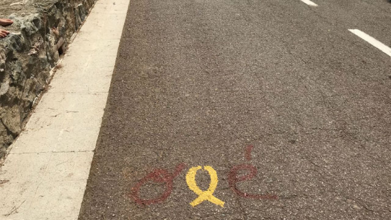 En una guerra por los símbolos, opositores a la separación catalana han agregado a tales lazos, con pintura roja, una “o” y una “é” con las que forman la muy española palabra “olé”.