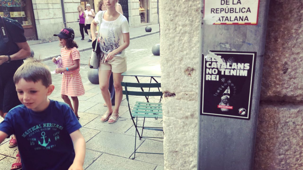"Municipio de la República catalana. Los catalanes no tenemos rey". Stickers en una de las calles principales de Girona. Foto: Marco Appel[/caption]