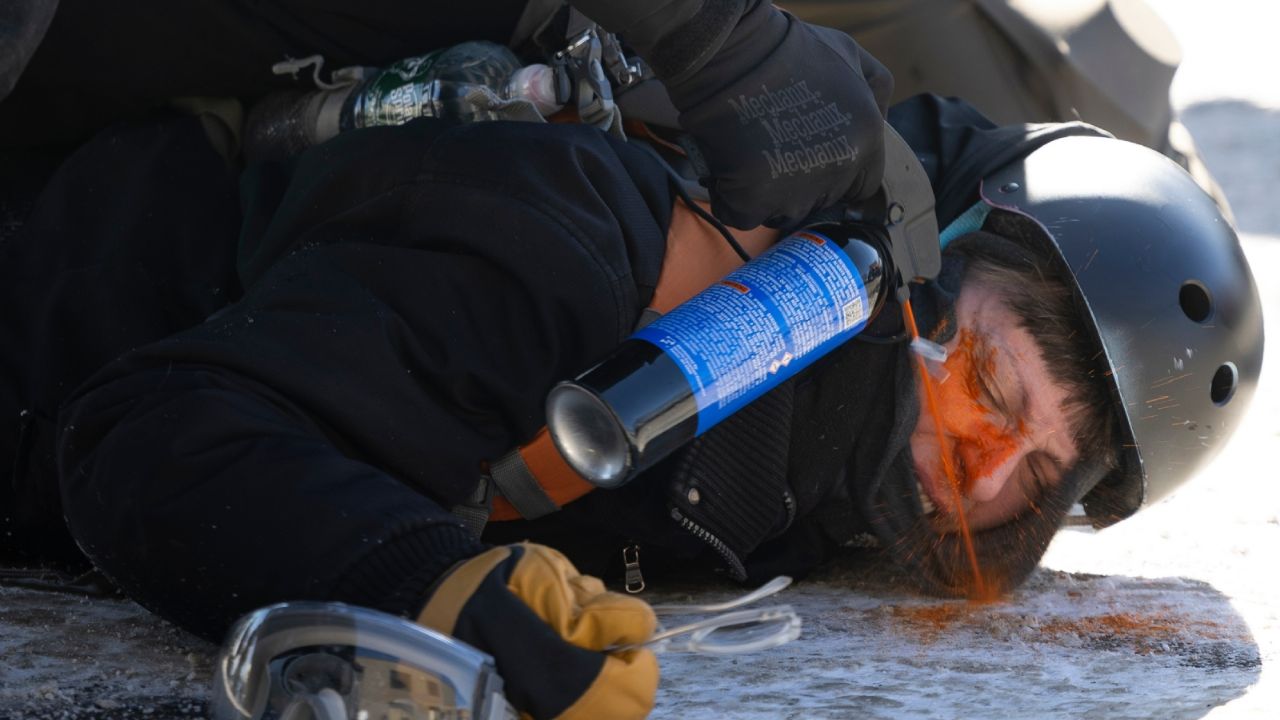 Pronto al menos siete agentes lo rodean. Uno está sobre su espalda, y otro que parece tener un bote en la mano le da un golpe en el pecho. Varios agentes intentan poner los brazos del hombre detrás de su espalda mientras parece resistirse. Mientras tiran de sus brazos, su rostro es brevemente visible. El agente con el bote lo golpea cerca de su cabeza varias veces.