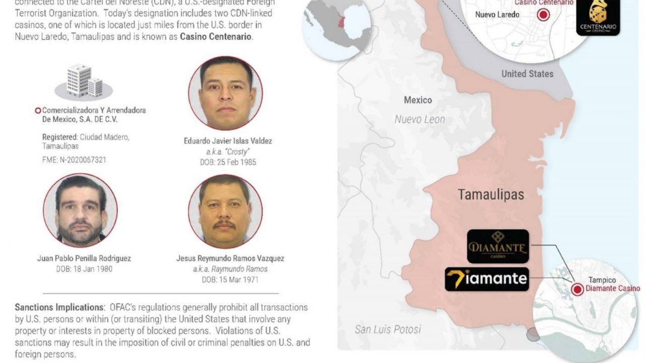 Por medio del vocero de la dependencia, Thomas Pigott, el gobierno de Donald Trump indicó que los casinos y facilitadores de narcotráfico y tráfico de personas, operan a lo largo de corredores fronterizos clave, entre los cuales se cuenta al de Nuevo Laredo, Tamaulipas.