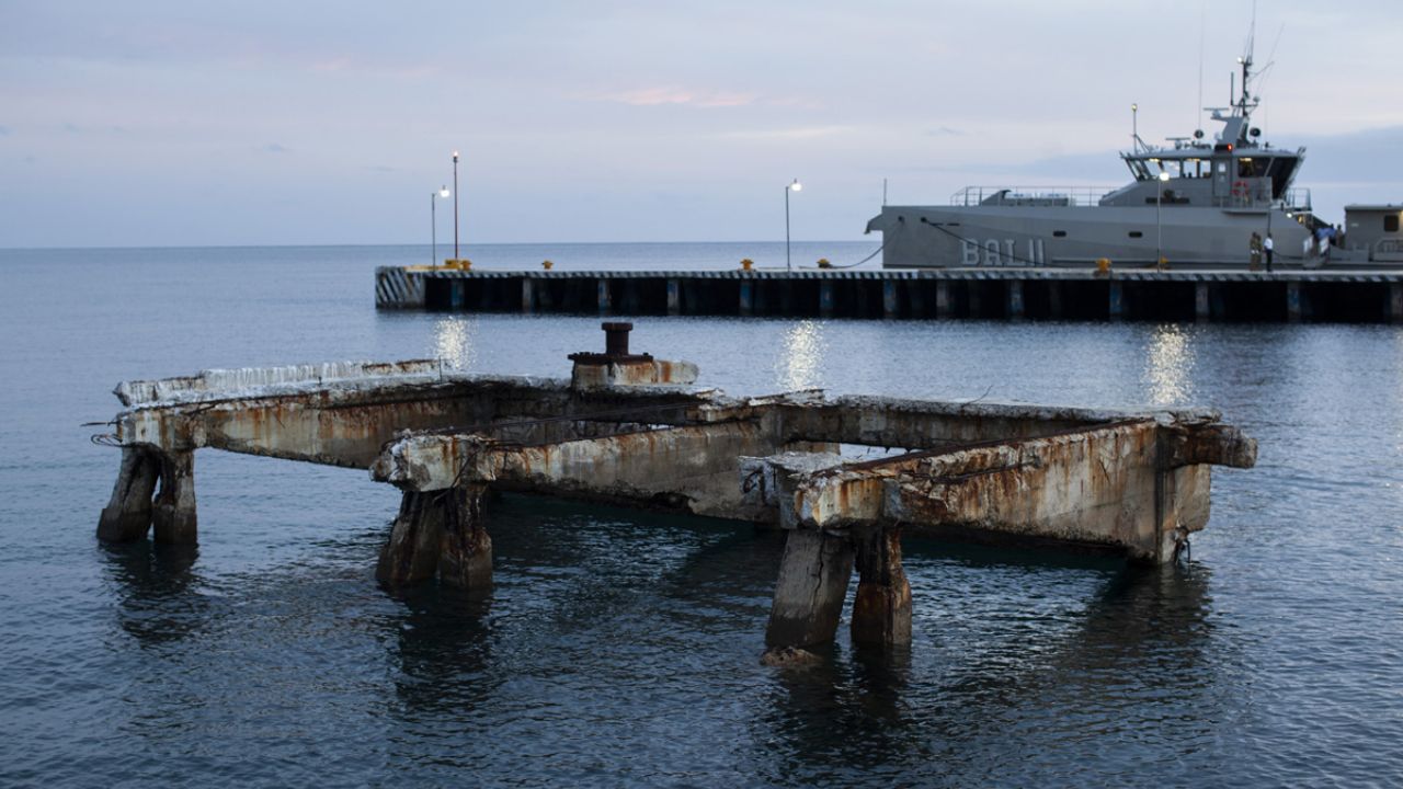 Las cabras caminan amansadas en un paisaje ruinoso: una construcción circular de dos pisos con ventanales rotos alrededor, las palmeras desmayadas, archivos y legajos húmedos arrumbados en una bodega. En tanto, los funcionarios hacen honores a la bandera. Un brigadista de protección civil advierte: “No se acerque mucho a las cabras, son salvajes”.