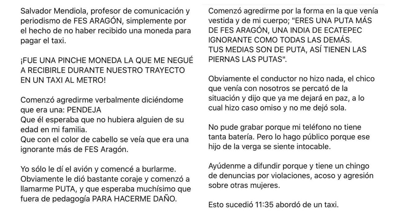 CIUDAD DE MÉXICO (apro).- Una estudiante de la Facultad de Estudios Superiores (FES) Aragón de la UNAM denunció en su cuenta de Facebook que el profesor Salvador Mendiola, de la carrera de Comunicación y Periodismo, “la agredió verbalmente” cuando ella rechazó la moneda que le dio para pagar el taxi colectivo.