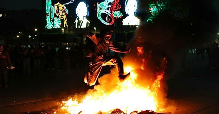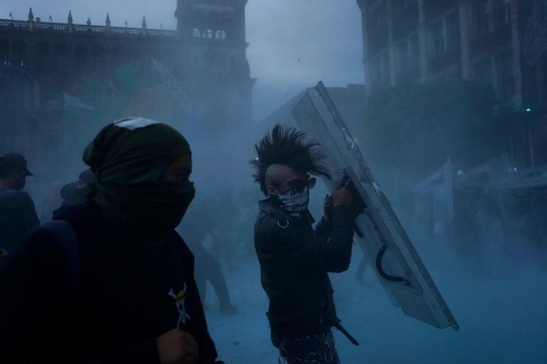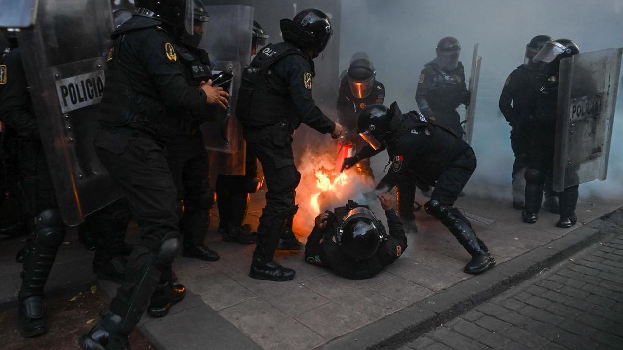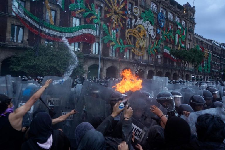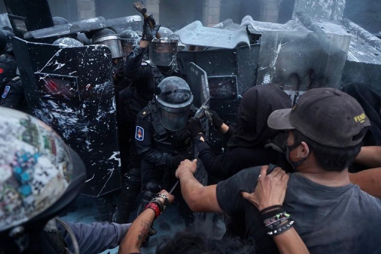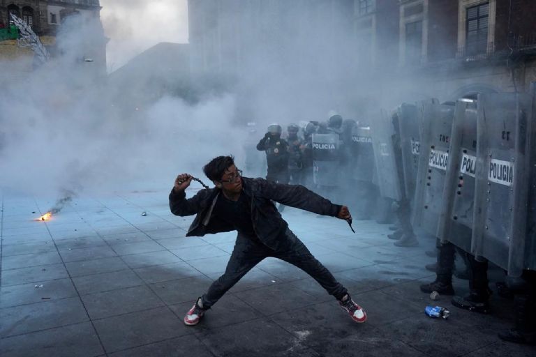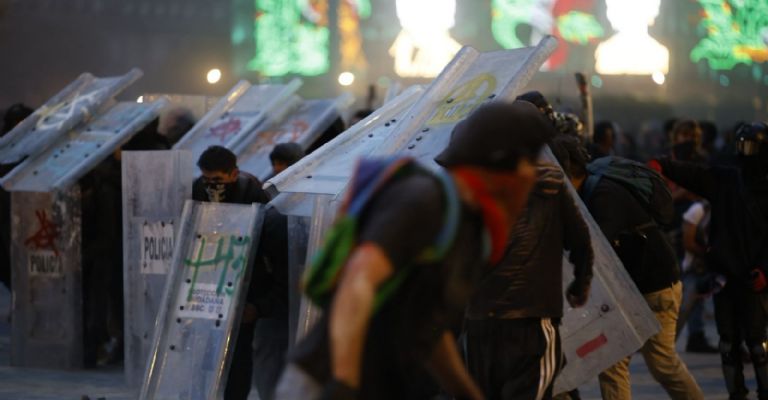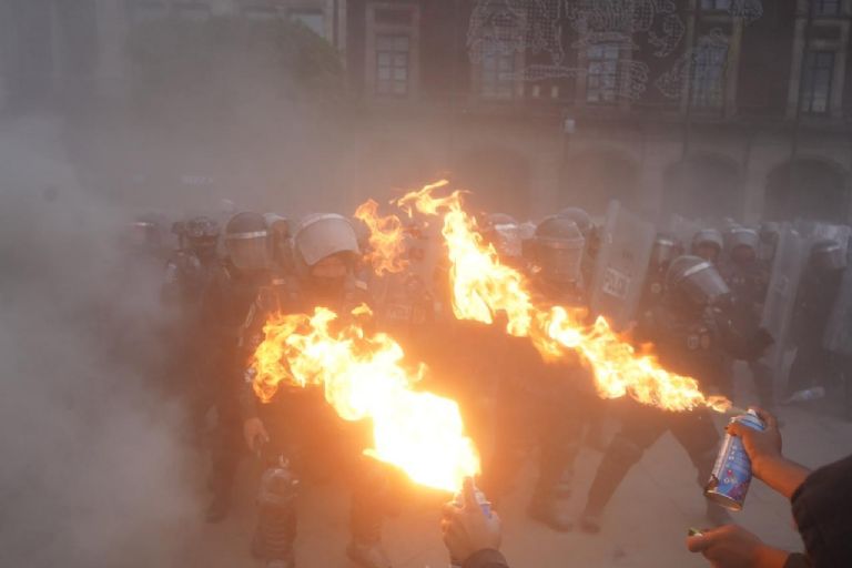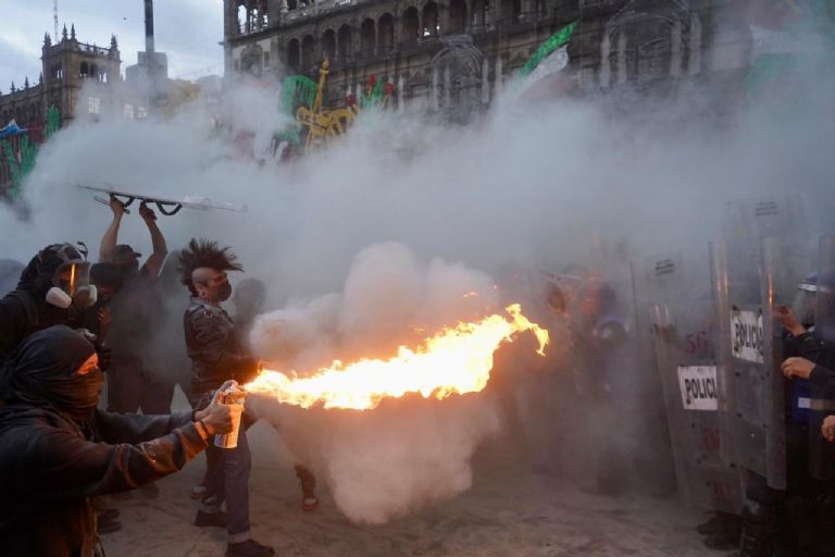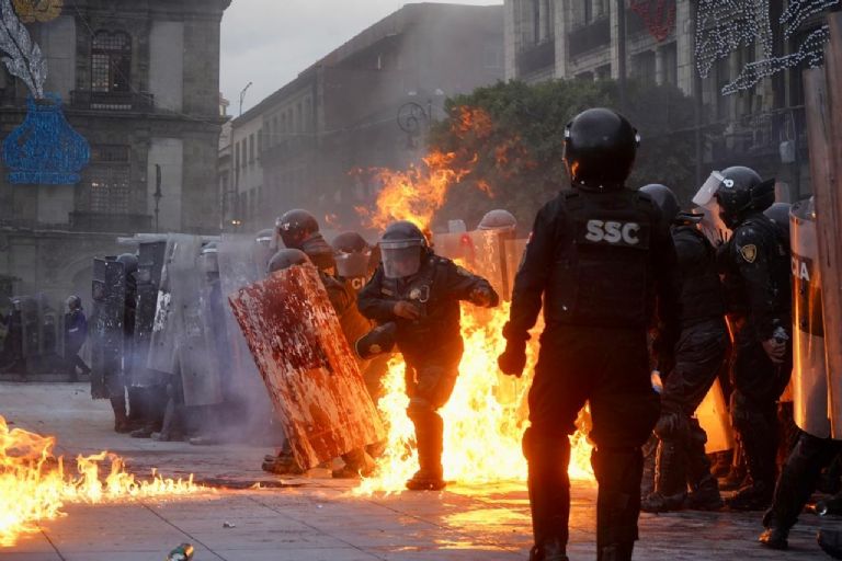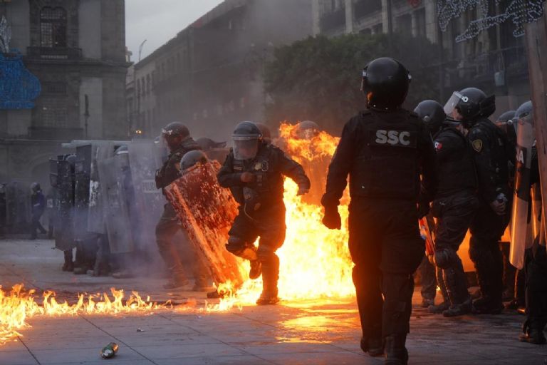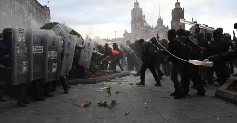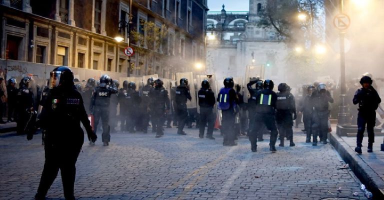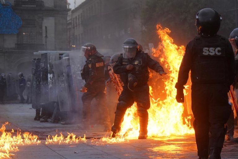 En las inmediaciones del Palacio de Bellas Artes, Eje Central y el Zócalo, los encapuchados lanzaron petardos, piedras, ladrillos y objetos incendiarios contra los policías, quienes respondieron con equipo antimotines, extintores y gases lacrimógenos para dispersar a los agresores.