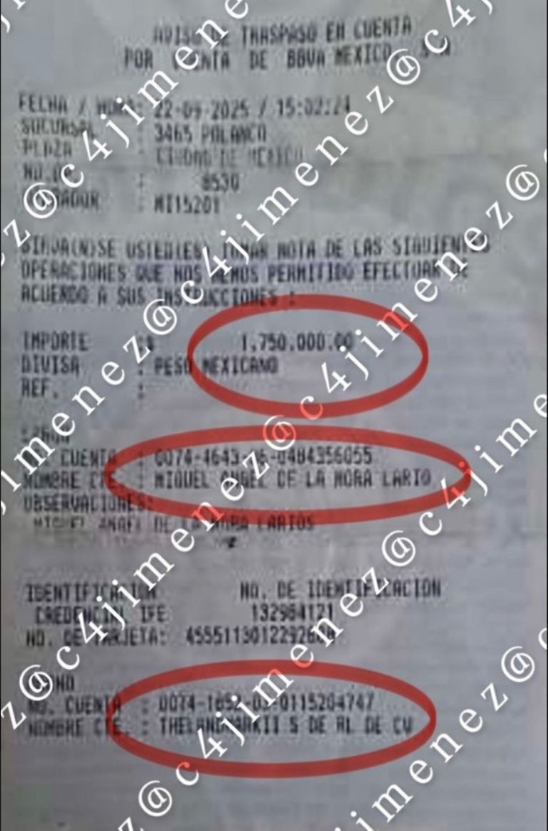 El documento fue localizado entre sus pertenencias el día del ataque, junto a objetos de lujo como un bolso Hermès, un tarjetero Cartier, su pasaporte y su teléfono celular. La operación se registró el 25 de septiembre de 2025 en una sucursal bancaria de la Ciudad de México y tuvo como destino una cuenta de la razón social THE LANDMARK II S. de R.L. de C.V., empresa dedicada a desarrollos inmobiliarios en Zapopan, Jalisco.