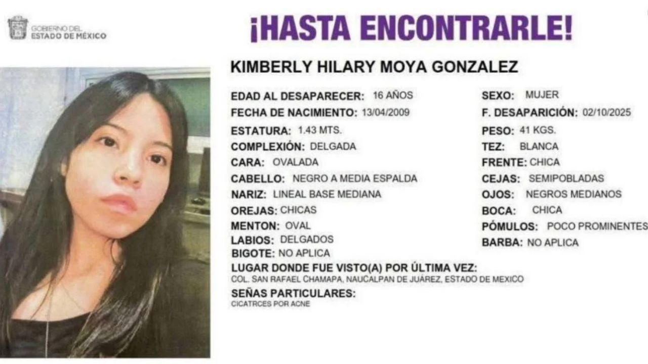 Kimberly Hilary Moya González, de 16 años, desapareció el 2 de octubre en Naucalpan. La Fiscalía del Edomex detuvo a dos hombres vinculados al caso y analiza si hay relación con una organización espiritista.CIUDAD DE MÉXICO (apro).— La Fiscalía General de Justicia del Estado de México (FGJEM) mantiene abierta la investigación por la desaparición de Kimberly Hilary Moya González, una estudiante de 16 años del Colegio de Ciencias y Humanidades (CCH) Naucalpan de la Universidad Nacional Autónoma de México (UNAM), vista por última vez el 2 de octubre de 2025 en el municipio de Naucalpan de Juárez.