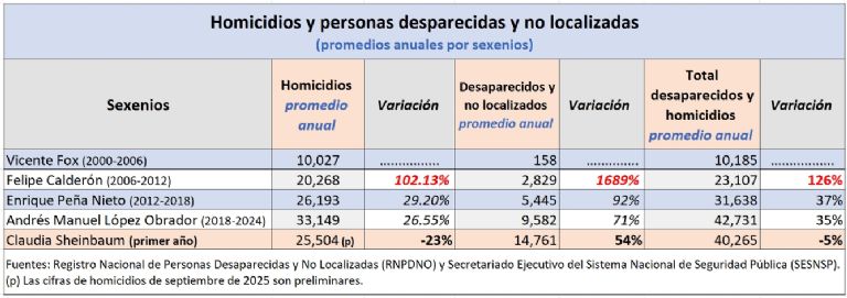 El sexenio en el que más han aumentado los homicidios y desapariciones es en el de Felipe Calderón (2006-2012), cuando la cifra anual promedio de ambos delitos fue de 23 mil 107, un 126% arriba del registro durante gobierno de Vicente Fox (2000-2006).