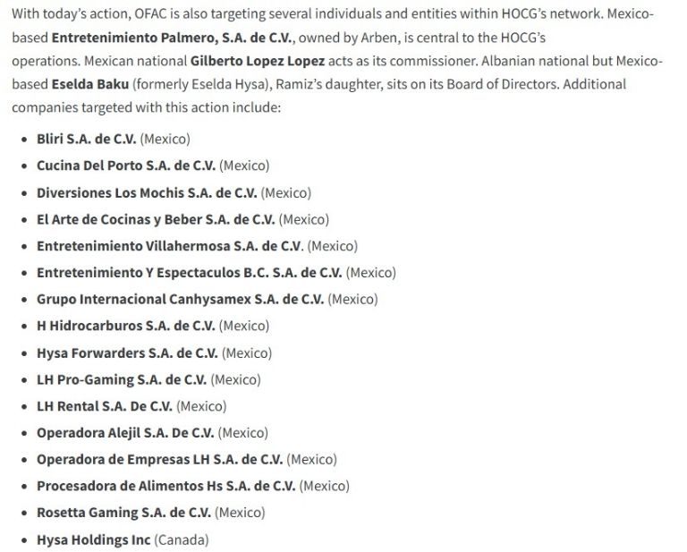 Otras personas y operaciones bajo las acciones de la OFAC que tienen como sede a México son: Entretenimiento Palmero, S.A. de C.V., que pertenecen a Arben, a su comisionado, Gilberto López López, a la ciudadana albana, Eselda Baku.
