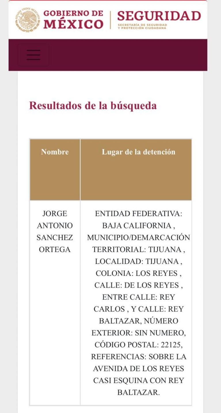 Sin embargo, el nombre de Jorge Antonio Sánchez Ortega aparece en el Registro Nacional de Detenciones (RND), donde se especifica que fue en la colonia Los Reyes de Tijuana, entre las calles Carlos y Baltazar, aunque no se especifica la hora ni fecha.