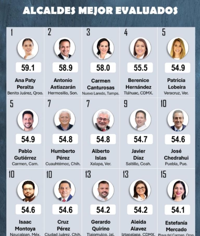 De los cinco alcaldes mejor evaluados a nivel nacional, cuatro son presidentas y ahí vemos a Patricia Peralta (Benito Juárez); Carmen Canturosas (Nuevo Laredo); Berenice Hernández (Tláhuac) y Patricia Lobeira (Veracruz), acompañados en este grupo por el presidente municipal de Hermosillo Antonio Astiazarán: