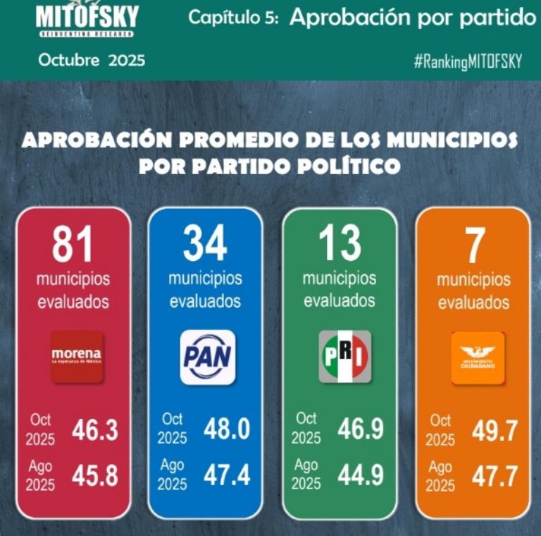 "Después de dos bimestres en los que las presidentas municipales estaban mejor evaluadas que los hombres, en octubre los hombres superaron en promedio por medio punto porcentual", se lee en el documento.CIUDAD DE MÉXICO (apro).-El Ranking de presidentes municipales de octubre 2025, realizado por la encuestadora Mitofsky muestra que se incrementa el promedio de aprobación de los alcaldes, y entre los cinco mejor evaluados aparecen cuatro mujeres.