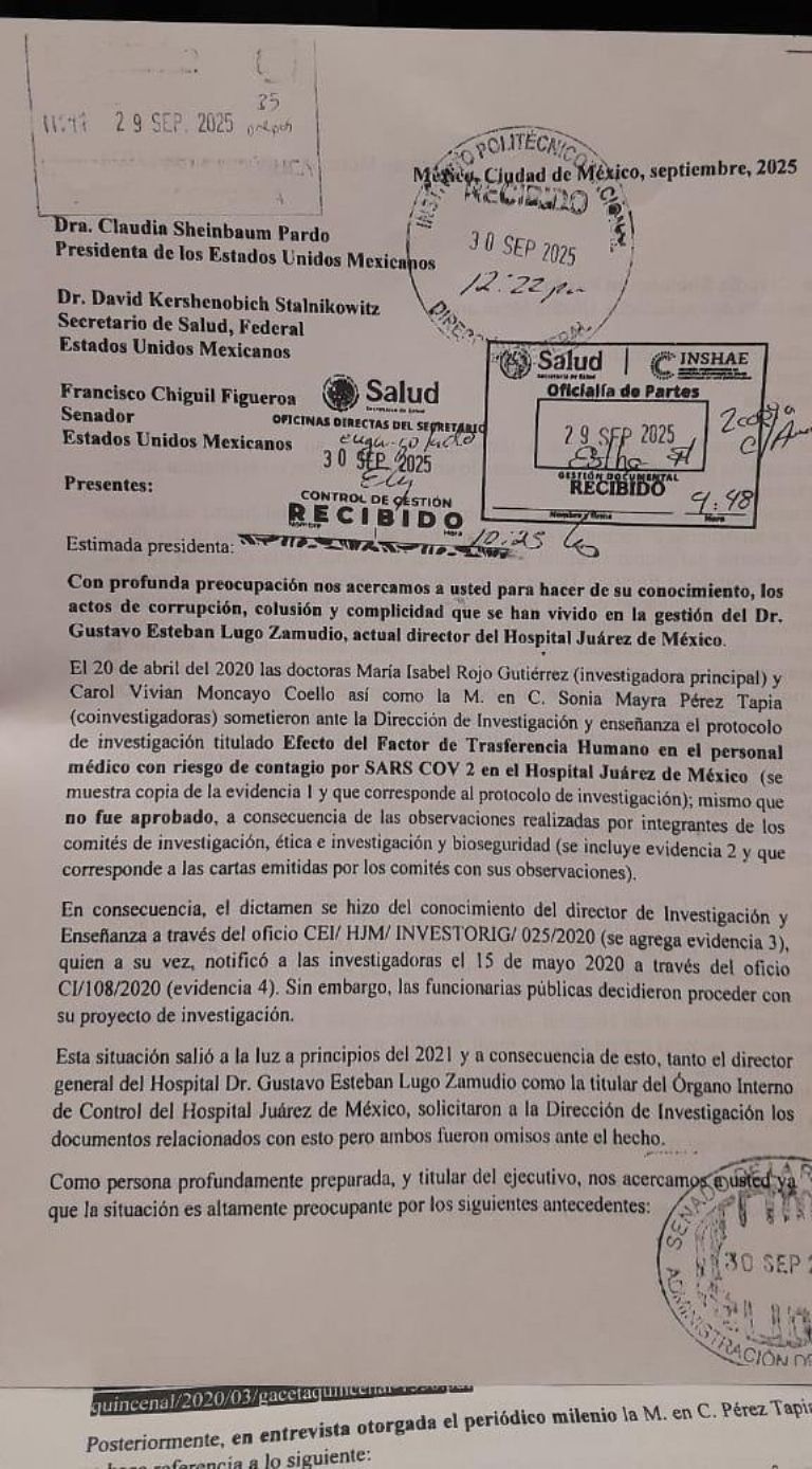 Los trabajadores mostraron diversos oficios, cuyas copias tiene Proceso, enviados meses atrás a la presidenta Claudia Sheinbaum Pardo, al mismo Kershenobich, así como a legisladores en los que denunciaron presuntas irregularidades cometidas o avaladas por Lugo Zamudio durante su gestión de cinco años, misma que terminó el lunes 8 de diciembre.