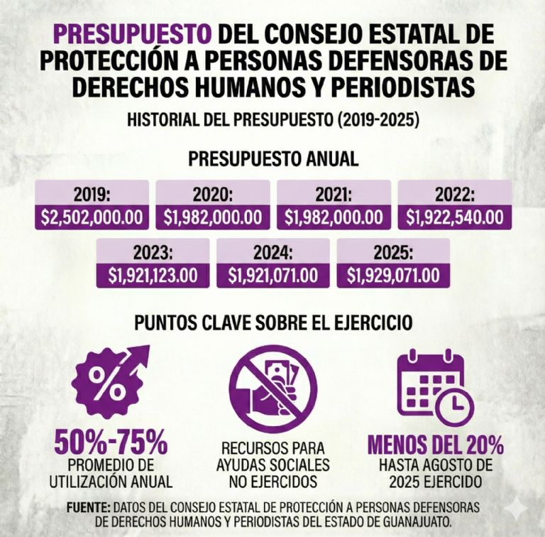 Desde su creación en 2017, el organismo opera con presupuestos limitados, diagnósticos obsoletos y subejercicios sistemáticos, dejando expuestas a quienes buscan protección frente a amenazas, agresiones y desplazamiento forzado.GUANAJUATO, Gto. (Proceso).- El Consejo Estatal de Protección a Periodistas y Personas Defensoras de Derechos Humanos ha dado respuestas insuficientes y poco efectivas a las solicitudes de apoyo de mujeres periodistas y activistas que han buscado su resguardo al encontrarse en riesgo o por sufrir una agresión en el ejercicio de su labor, tal como asienta la ley en la que basa sus funciones.