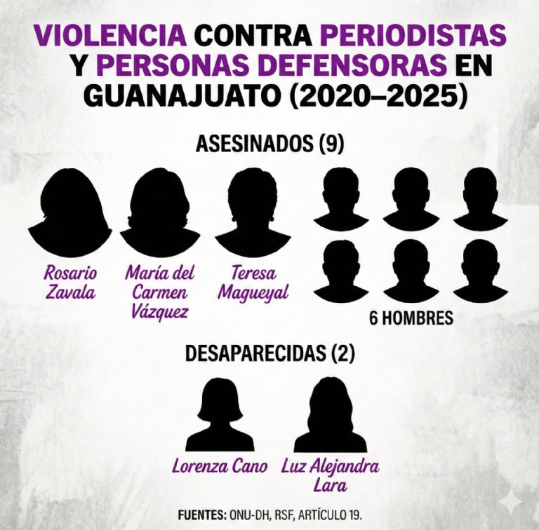 De acuerdo con reportes de la ONU-Derechos Humanos y organizaciones como Reporteros Sin Fronteras y Artículo 19, desde 2015 en Guanajuato han sido asesinadas 10 personas periodistas y defensoras de derechos humanos; tres de ellas eran mujeres buscadoras. Otras dos defensoras están desaparecidas. Datos del Consejo Estatal indican que, de 2019 a la fecha, 40 mujeres periodistas y 58 defensoras han solicitado medidas de protección debido a situaciones de riesgo.