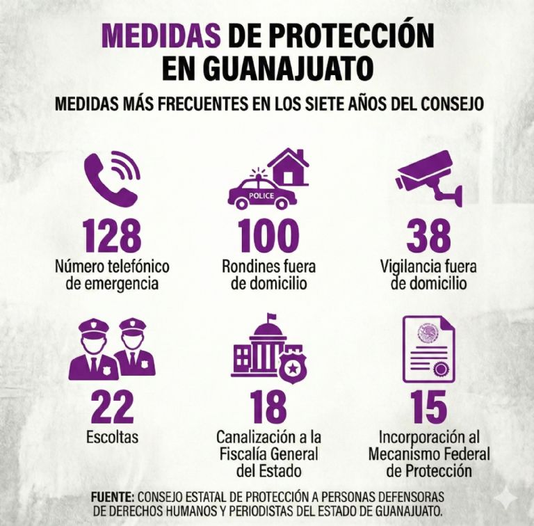 Según registros del Consejo, los municipios con más medidas de protección otorgadas son Celaya, León, Irapuato, Pénjamo, Guanajuato capital, San Luis de la Paz y Salamanca. La mayoría de las 373 medidas emitidas consisten en la entrega de teléfonos y rondines, mientras que la canalización formal a la Fiscalía o al Mecanismo Federal sólo ha ocurrido en 15 casos.