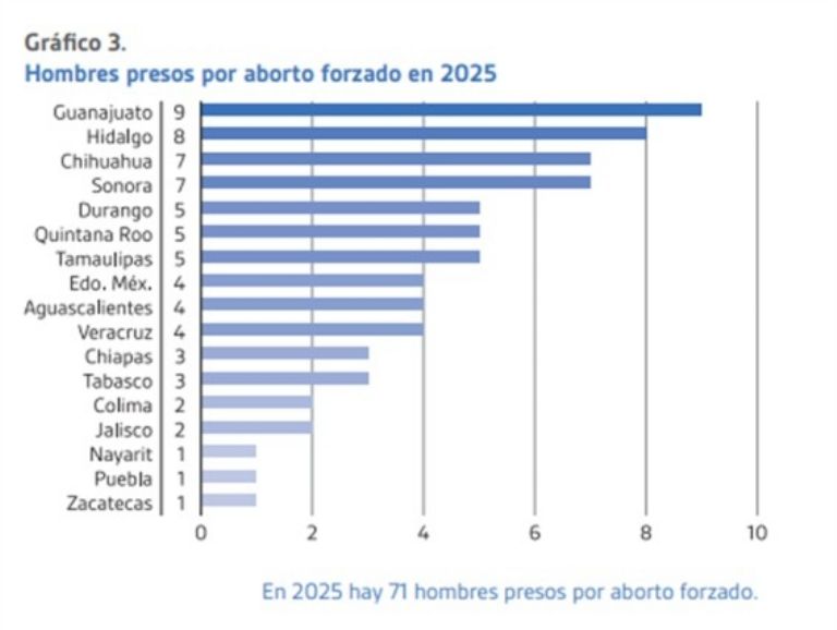 Los datos, recabados de fiscalías estatales y de otras instancias locales, revelaron que actualmente hay 71 hombres privados de la libertad por este delito, frente a siete mujeres, quienes no fueron procesadas por abortos autoprocurados, sino por haber participado en la comisión de otros delitos vinculados, incluido el aborto forzado.