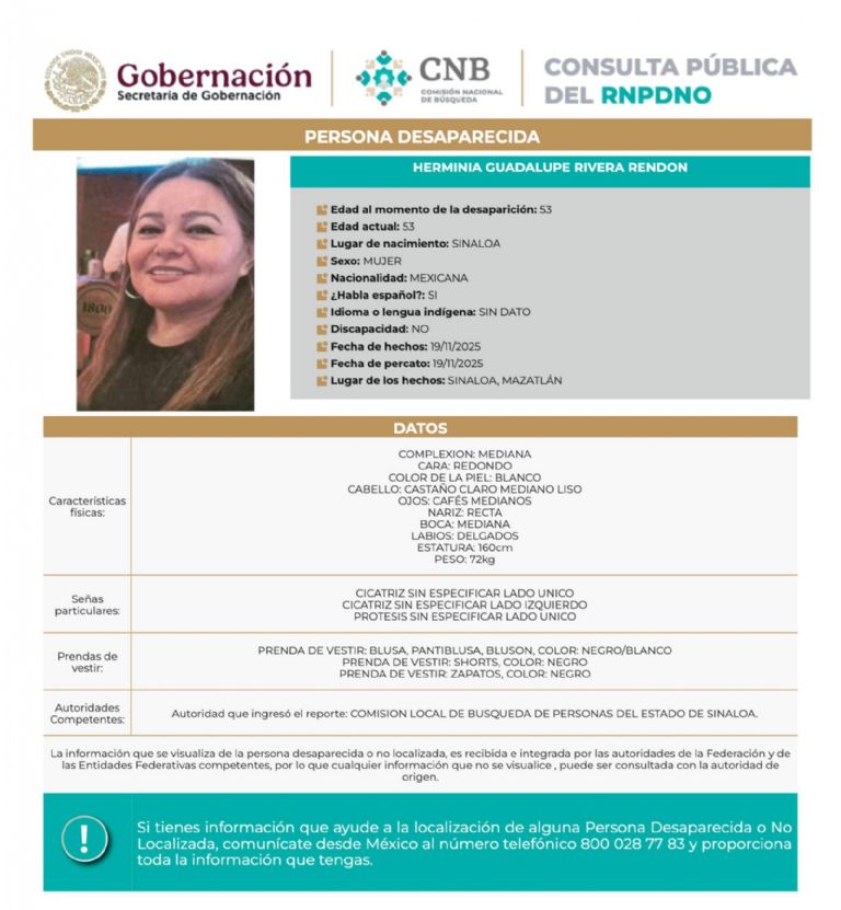 La víctima fue privada de la libertad en noviembre último junto a otra mujer por un grupo armado y desde entonces se desconoce su paradero.CULIACÁN, Sin. (apro).- La Fiscalía General de la República (FGR) absorbió el caso de la desaparición de Herminia Guadalupe Rivera Rendón, hija de una madre buscadora y pareja de un periodista de Mazatlán.