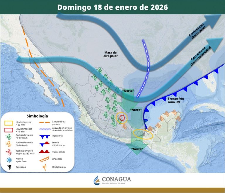 Mientras tanto, la masa de aire polar que impulsa al sistema seguirá generando evento de “Norte” intenso con rachas de hasta 100 kilómetros por hora en el istmo de Tehuantepec y con oleaje de hasta 4.5 metros de altura en el golfo de Tehuantepec, y fuerte con rachas de viento de 40 a 60 km/h con oleaje de hasta 3 metros de altura en Tamaulipas, Veracruz, Tabasco, Campeche, Yucatán y Quintana Roo.