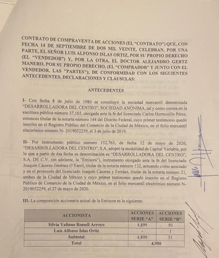 Alejandra Cuevas Morán, hija de la excuñada de Gertz Manero, dio a conocer en redes sociales un contrato de compraventa de una acción que el entonces fiscal general realizó a título personal con uno de los accionistas minoritarios de la empresa Desarrolladora del Centro, S. A. de C. V., a quien pagó 10 mil dólares, equivalentes a 213 mil 210 pesos al momento de la operación, a pesar de que la misma tiene un valor de un peso.