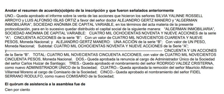 En consecuencia, la compra de acciones por parte de ALGERMAN a Desarrolladora del Centro, en realidad convirtió automáticamente al exfiscal en dueño de la empresa cuyo objeto social fue modificado el 17 de abril de 2020, cinco meses antes de que Gertz Manero la adquiriera.