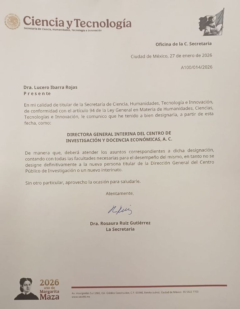 En el oficio A100/014/2026, Ruiz Gutiérrez agregó: “deberá atender los asuntos correspondientes a dicha designación, contando con todas las facultades necesarias para el desempeño del mismo, en tanto no se designe definitivamente a la nueva persona titular de la Dirección General del Centro Público de Investigación o un nuevo interinato”.