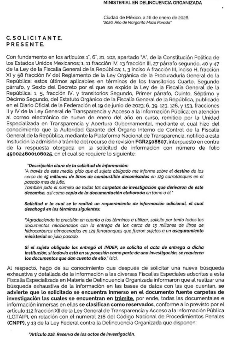 Proceso impugnó la respuesta de la FGR, hasta que este miércoles 28, cerca de dos meses desde la toma de protesta de Godoy, obtuvo una respuesta de la Dirección General de Apoyo Jurídico y Control Ministerial en Delincuencia Organizada, adscrita a la Fiscalía Especializada en Materia de Delincuencia Organizada (FEMDO), en la cual advirtió que: