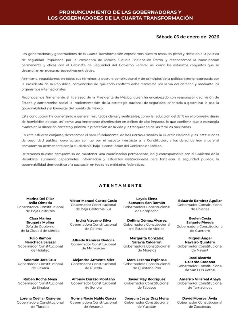 En este contexto, el pronunciamiento firmado por los gobernadores de Morena, al que se adhiere la jefa de Gobierno capitalina, expresa apoyo “pleno y decidido” a la política de seguridad del Gobierno de México y respalda la postura constitucional de la presidenta, basada en la solución pacífica de los conflictos, el respeto al derecho internacional y el papel de los organismos multilaterales.