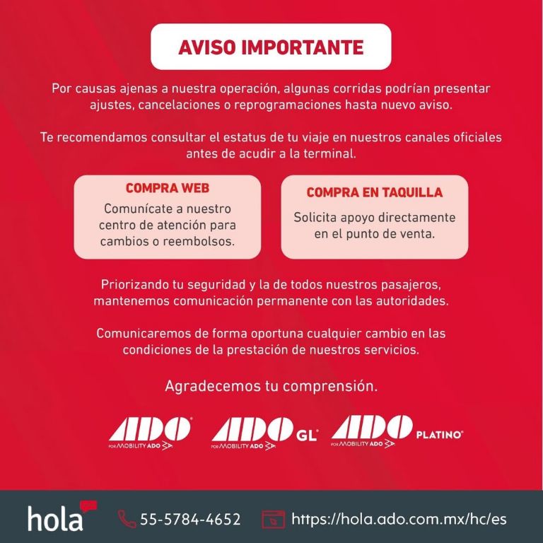 “Por causas ajenas a nuestra operación, algunas corridas podrían presentar ajustes, cancelaciones o reprogramaciones hasta nuevo aviso”, anunció ADO.