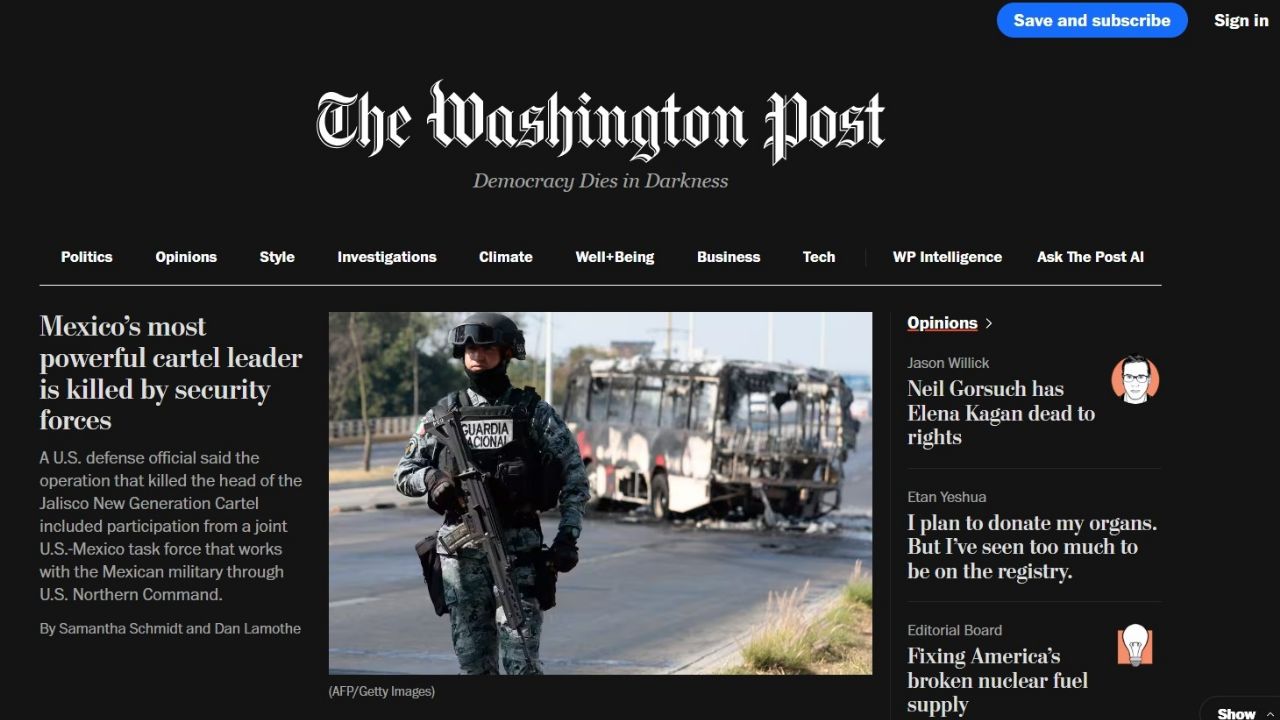 Asimismo, The Washington Post mantiene hasta la redacción de esta nota, como su principal titular la cobertura, con la cabeza “El líder del cártel más poderoso de México, El Mencho, fue asesinado por fuerzas de seguridad”. La noticia del Post destaca la “inteligencia complementaria” brindada por autoridades estadunidenses. Además, da cuenta de las represalias violentas en múltiples estados, como Jalisco, Michoacán y Guerrero.