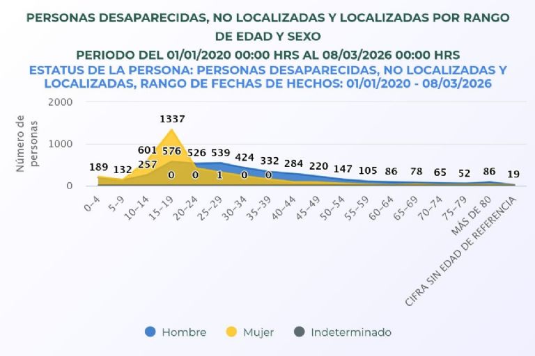 En Puebla las mujeres jóvenes son las que tienen un riesgo mayor de ser desaparecidas. Según el Registro Nacional de Personas Desaparecidas y No Localizadas (RNPDNO), de las 3 mil 784 desaparecidas, no localizadas y localizadas de 2020 a lo que va de 2026, el 51.1% está en el rango etario de 10 a 19 años, siendo un pico la edad de 15 a 19 años.