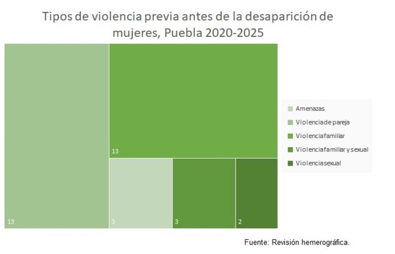 En Puebla no existe información oficial sobre en cuántas desapariciones de mujeres, adolescentes y niñas hubo violencias previas, pero una revisión hemerográfica hecha para esta investigación detectó 34 casos de 2020 a 2025. Se trataron, principalmente, de violencias de pareja y familiar, pero también hubo casos de violencia sexual y amenazas.