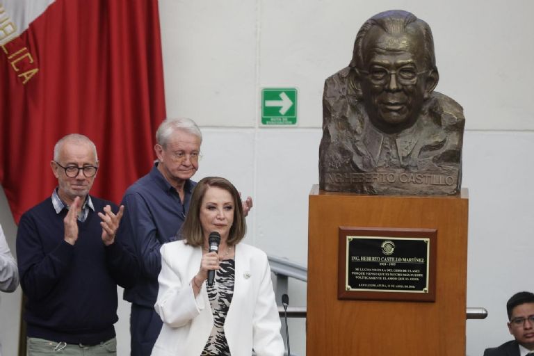 Posteriormente, develaron un busto de Heberto Castillo con la leyenda: Ingeniero Herberto Castillo Martínez1928-1997, Mi lucha no es la del odio de clases, porque pienso que es mucho más fuerte políticamente el amor que el odio. LXVI legislatura, 14 de abril del 2026.