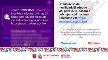 En una tarjeta informativa, la dependencia informó que identificó SMS que informan sobre presuntas infracciones pendientes, incluyen vínculos para “consultar” o “pagar”, solicitan datos personales o bancarios y presionan a los usuarios para efectuar transferencias de manera inmediata.