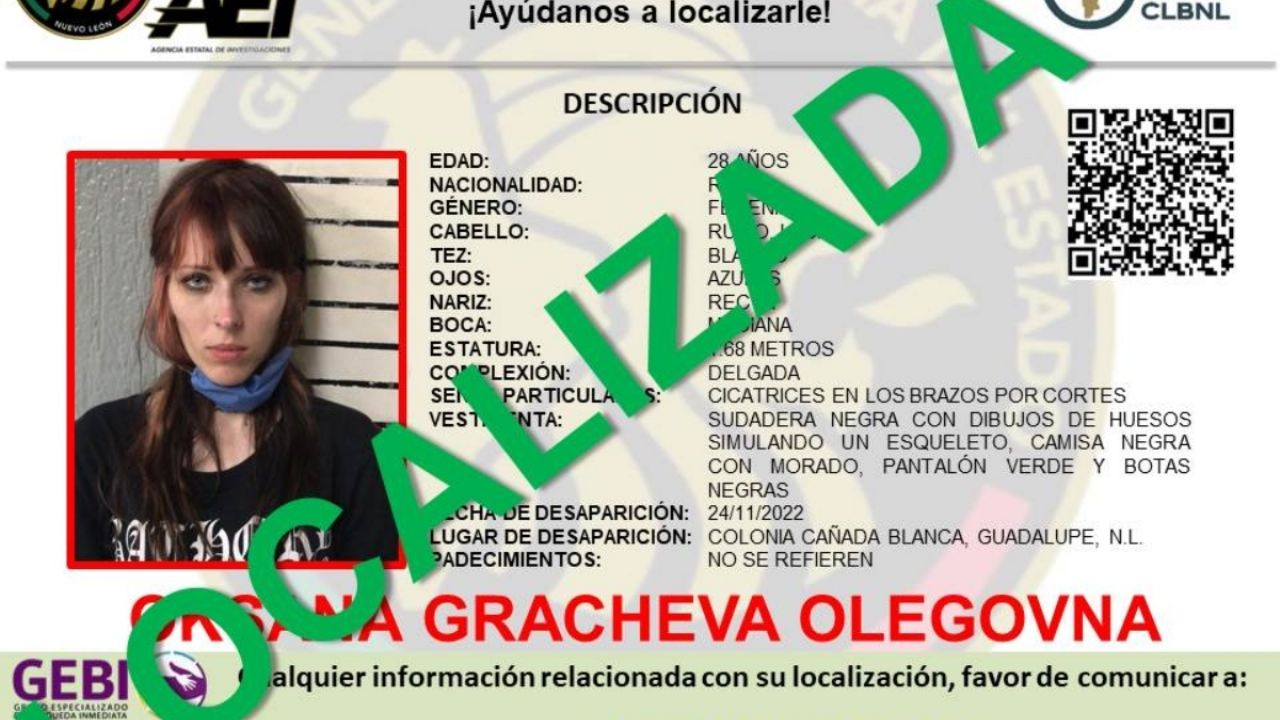 Oksana Gracheva Olegovna, de 28 años, fue reportada desaparecida el 24 de noviembre en la colonia Cañada Blanca, en territorio guadalupense, de acuerdo con el reporte de la Comisión de Búsqueda de Nuevo León.
