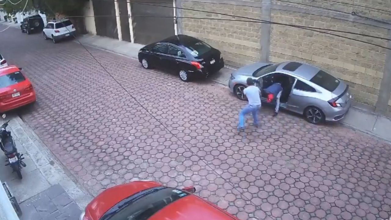 En el clip se aprecia que un sujeto vestido de azul y gorra roja logra entrar por la puerta del conductor a un vehículo Honda, color gris, que está estacionado, mientras su cómplice, de chamarra clara y pantalón oscuro, con gorra y cubrebocas, vigila el lugar.