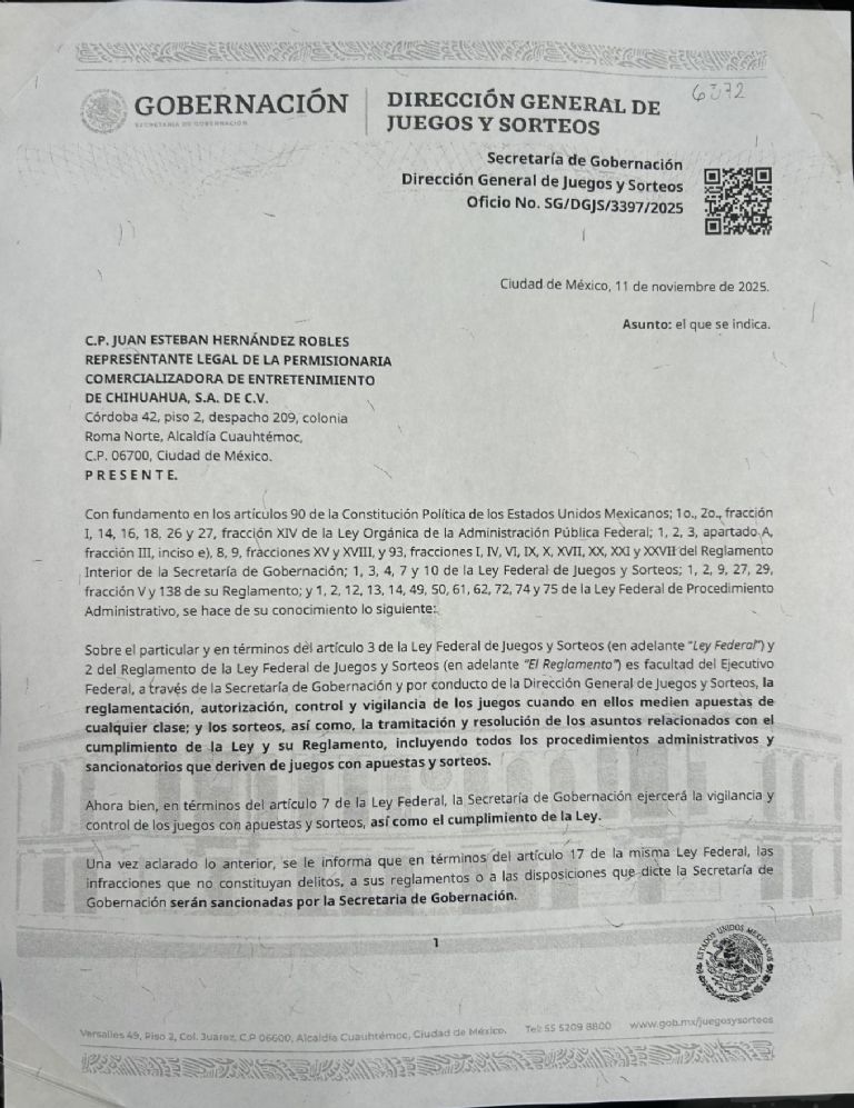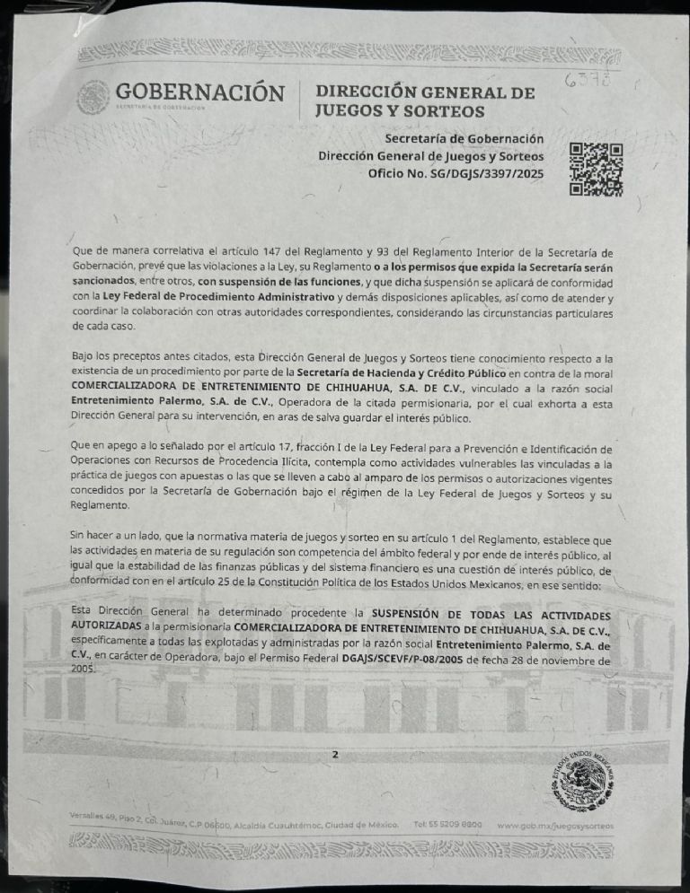Conforme a los datos consultados en el lugar, personal de la Secretaría de Gobernación (Segob), a través de la Dirección General de Juegos y Sorteos, ordenó la suspensión de todas las actividades de la empresa Comercializadora de Entretenimiento de Chihuahua, S.A. de C.V., operadora del Casino Skampa.