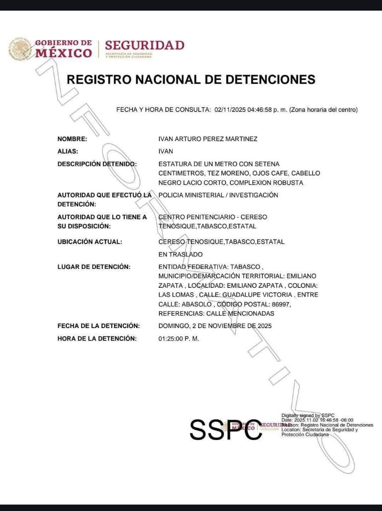 El exfuncionario fue capturado en la colonia Las Lomas, del municipio de Emiliano Zapata, a las 13:25 horas y fue trasladado al Centro de Reinserción Social (Cereso) de Tenosique, de acuerdo con el Registro Nacional de Detenciones de la Secretaría de Seguridad y Protección Ciudadana (SSyPC) federal.