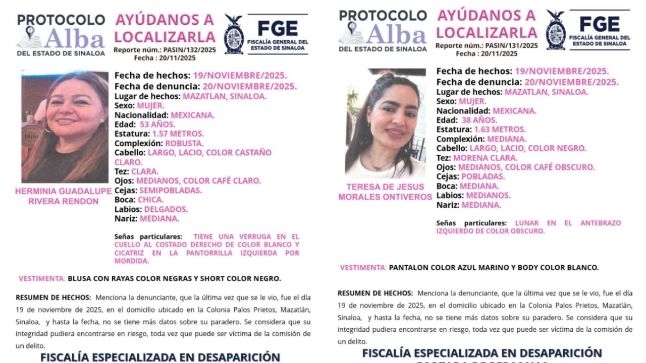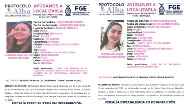 Mazatlán junto a Culiacán acumulan más del 70 por ciento de los casos por privación de la libertad.CULIACÁN, Sin. (apro).- La Fiscalía General del Estado (FGE) lanzó dos fichas de Protocolo Alba por la desaparición de dos mujeres, en Mazatlán, quienes fueron víctimas de privación ilegal de la libertad la noche del miércoles 19 de noviembre.