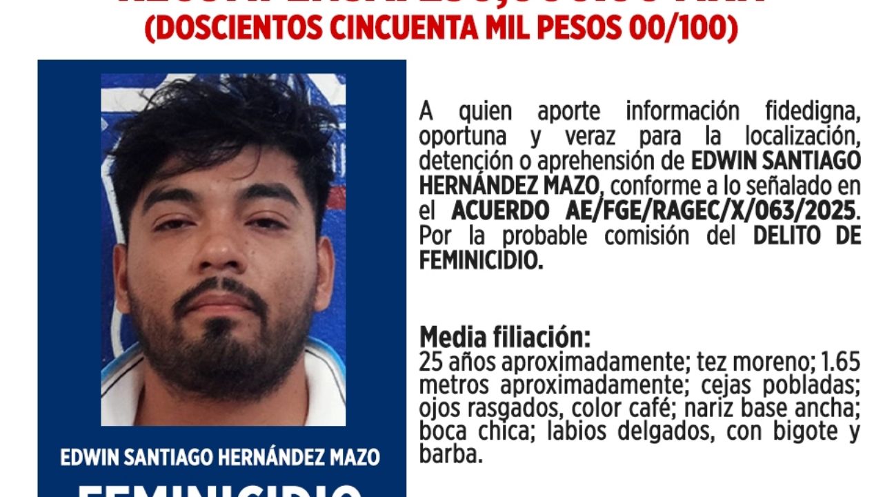 Fiscalía de Tabasco ofrece recompensa de 250 mil pesos por presunto feminicida