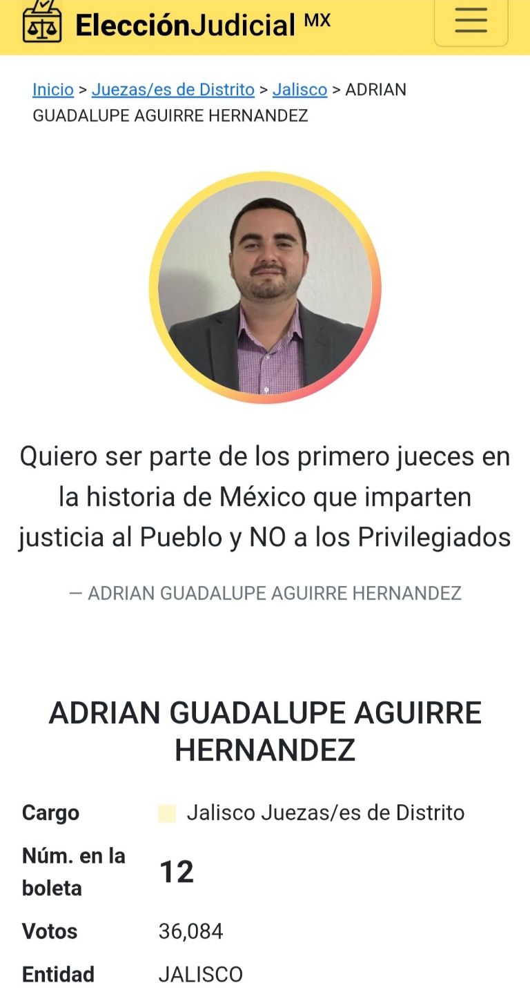 Aguirre Hernández fue uno de los 386 jueces federales elegidos por voto popular en las recientes elecciones judiciales. Su dimisión a sus funciones en el Centro de Justicia Penal Federal en Puente Grande, Jalisco, se presentó solo dos meses después de haber tomado protesta.GUADALAJARA, JAL., (apro) .- "Quiero ser parte de los primeros jueces en la historia de México que imparten justicia al pueblo y no a los privilegiados." Bajo esta promesa de campaña se promovió Adrián Guadalupe Aguirre Hernández para Juez de Distrito en materia penal.