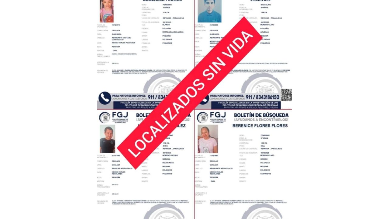 Luego de varios días de búsquedas, se logró la localización, primero de tres cuerpos sin vida en un camino de terracería a las afueras de la ciudad, de acuerdo con información de la Fiscalía General de Justicia del Estado de Tamaulipas.