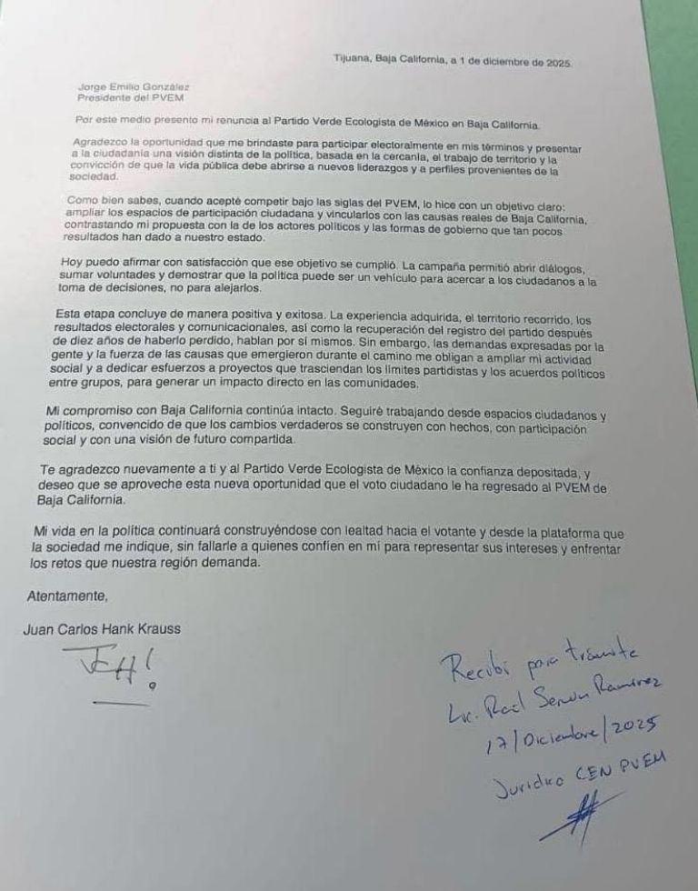 La renuncia se aprecia en una carta divulgada el miércoles 17 de diciembre a la prensa; Hank Krauss cuenta con 38 años y apenas debutó en política desde el 2021, en una regiduría en el Ayuntamiento de Tijuana, Baja California.