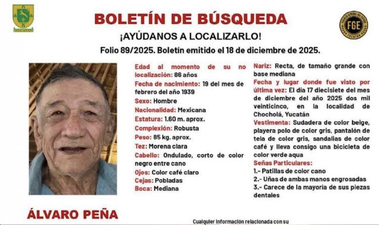 Álvaro Peña Quintal desapareció el día 17 de diciembre. El adulto mayor vivía solo en el municipio de Chocholá y los videos de vigilancia captaron el momento en que salió de su casa. Se desconoce cómo es que logró llegar a las vías del megaproyecto e ingresó a las vías del tren.