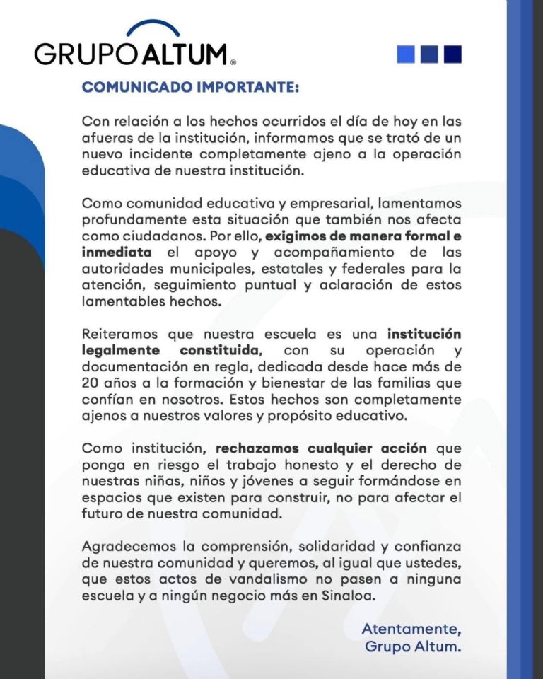 La institución afectada es el colegio Altum, uno de los inmuebles señalados en advertencias circuladas en redes sociales de ser atacadas por presuntos nexos con una de las facciones en guerra en Sinaloa.