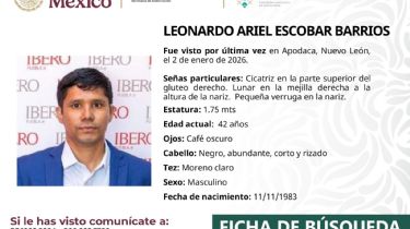 El último contacto que se tuvo con Leonardo Ariel Escobar Barrios, académico de la Universidad Iberoamericana Puebla, fue en el municipio de Apodaca.MONTERREY, NL. (apro).- La Agencia Estatal de Investigaciones de Nuevo León emitió una ficha de búsqueda por la desaparición de Leonardo Ariel Escobar Barrios, académico de la Universidad Iberoamericana Puebla, de nacionalidad colombiana, quien fue visto por última vez en el municipio de Apodaca.