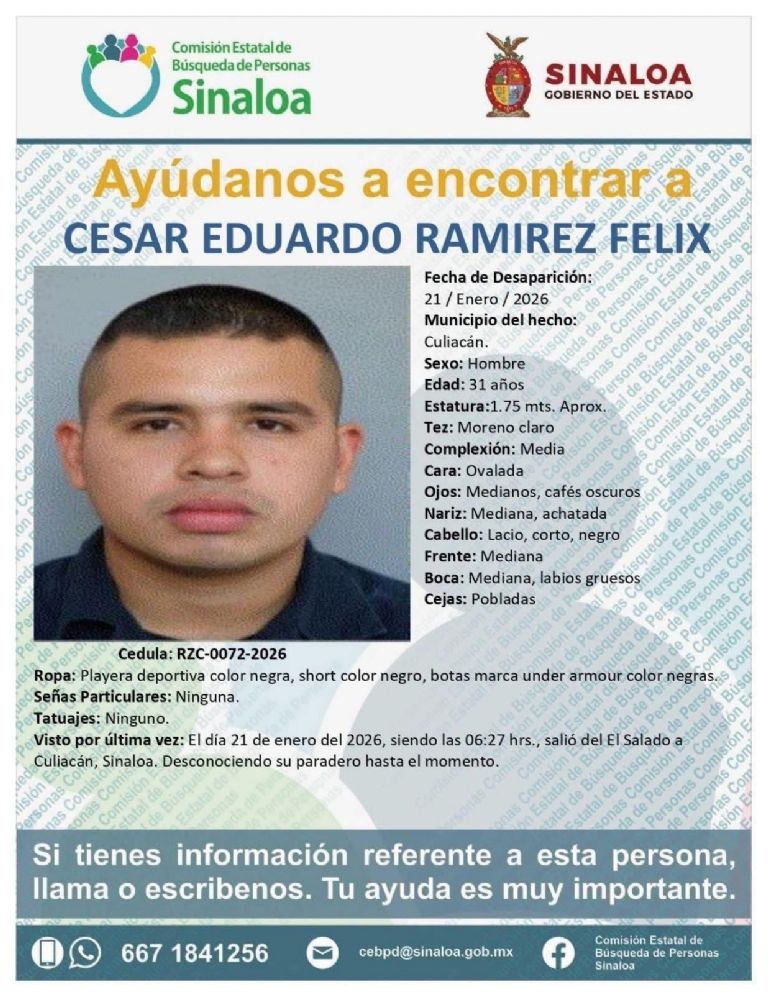El agente fue identificado como César Eduardo Ramírez Félix, de 37 años, quien había sido reportado como desaparecido desde la tarde del miércoles 21 en la comunidad de El Salado, al oriente de Culiacán. Derivado de su desaparición, la Comisión Estatal de Búsqueda emitió una ficha para su localización.