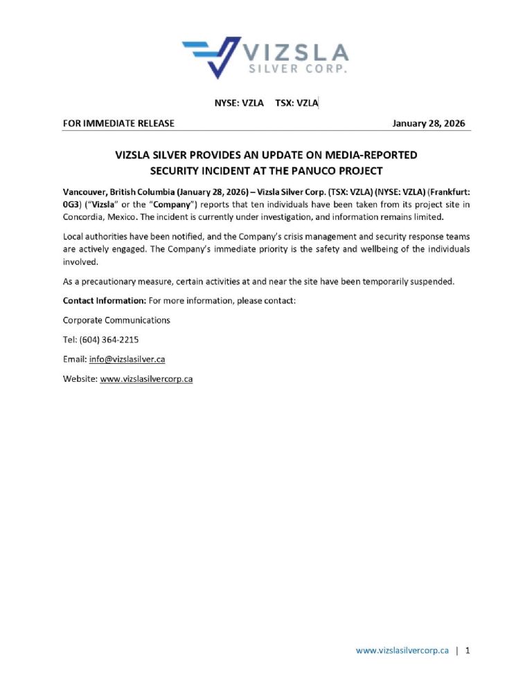 El 23 de enero 10 trabajadores fueron privados de su libertad por un grupo armado que ingresó al complejo “La Clementina”, en Sinaloa.CULIACÁN, Sin., (apro) .- Vizsla Silver Group se pronunció sobre los hechos ocurridos en el proyecto Pánuco, enclavado en lo alto de la sierra de Concordia, donde fueron privados de su libertad 10 trabajadores de dicha empresa con sede en Canadá.